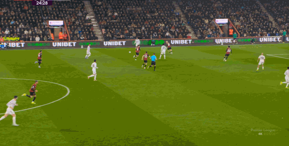 那么在這場(chǎng)比賽,曼聯(lián)的弱點(diǎn)是如何暴露出來(lái)的?其實(shí)就發(fā)生在第27分鐘這次高位逼搶,伯恩茅斯分到邊路之后,庫(kù)尼亞稍微松懈一點(diǎn)點(diǎn),他們就成功搶到了卡塞米羅的身前,從而制造了他的黃牌: