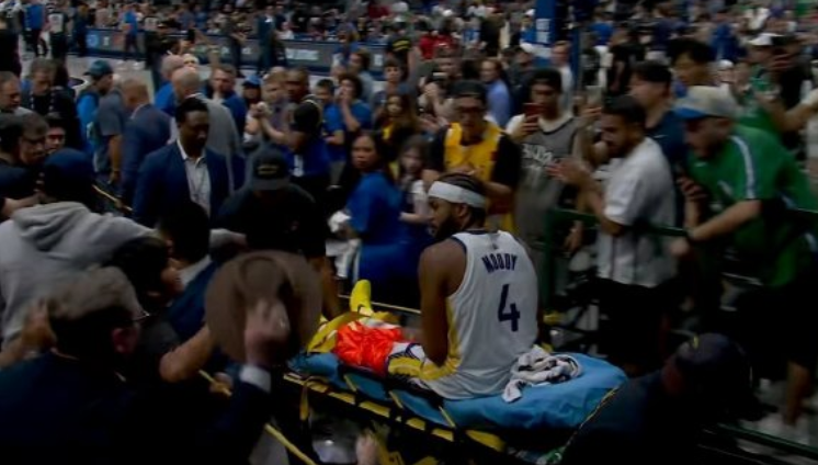 勇士隊在那場比賽里跟達拉斯小牛隊進行了一場加時大戰(zhàn),驚險獲勝,但卻收到了非常壞的消息。在加時賽里的一次快攻反擊,勇士隊的穆迪自己持球沖擊籃筐,沒想到在無接觸的情況下突然受傷,直接倒地。