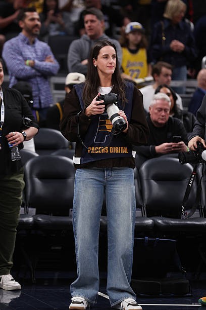 本場(chǎng)比賽,WNBA印第安納狂熱球星克拉克現(xiàn)場(chǎng)觀賽,并擔(dān)任場(chǎng)邊攝影記者,她身著攝影記者馬甲,手持搭配G大師70-200的索尼相機(jī)在場(chǎng)邊攝影區(qū)進(jìn)行拍攝。