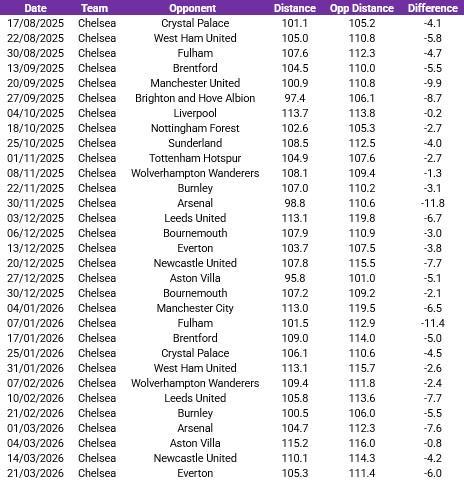 切爾西本賽季已經(jīng)完成31場英超比賽,場均跑動距離為106.1公裡,為英超倒數(shù)第一,距離排行榜榜首的曼城差距為9.6公裡,幾乎相當(dāng)於一名球員的全場跑動距離。