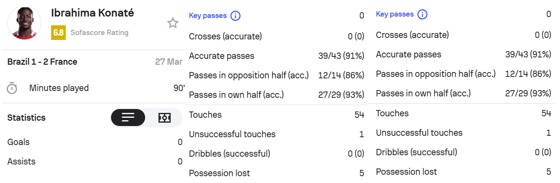 科納特本場比賽完成3次攔截,1次解圍,1次封堵射門,3次奪回球權(quán)。54次觸球,43腳傳球,傳球成功率91%。