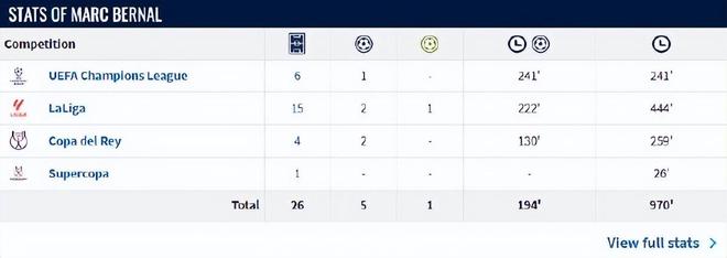 本賽季貝爾納爾復(fù)出之后,已經(jīng)為巴薩在各項(xiàng)賽事中出戰(zhàn)26場,一共踢了970分鐘。弗里克最初對他的使用非常耐心,直到德容受傷后,才讓貝爾納爾重新成為先發(fā),出任球隊(duì)后腰。