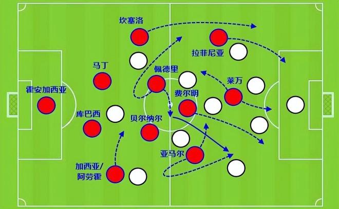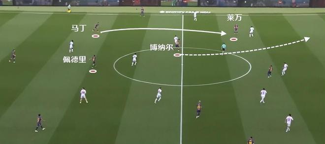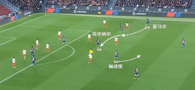 尤其是亞馬爾持球從邊路內(nèi)切時,當(dāng)佩德里向外線走,對方注意力自然會被帶走,于是前頂?shù)浇麉^(qū)前的貝爾納爾就有了用武之地。