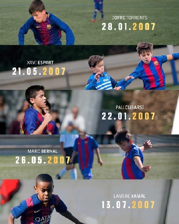 在見證了87一代的輝煌后,拉瑪西亞又涌現(xiàn)出一批新的天才。恰好比87一代小了20歲,同樣都生于2007年的亞馬爾、庫巴西和貝爾納爾組成了全新的三人組。跟他們一樣,出生于2007年的還有埃斯帕特和托倫茨。