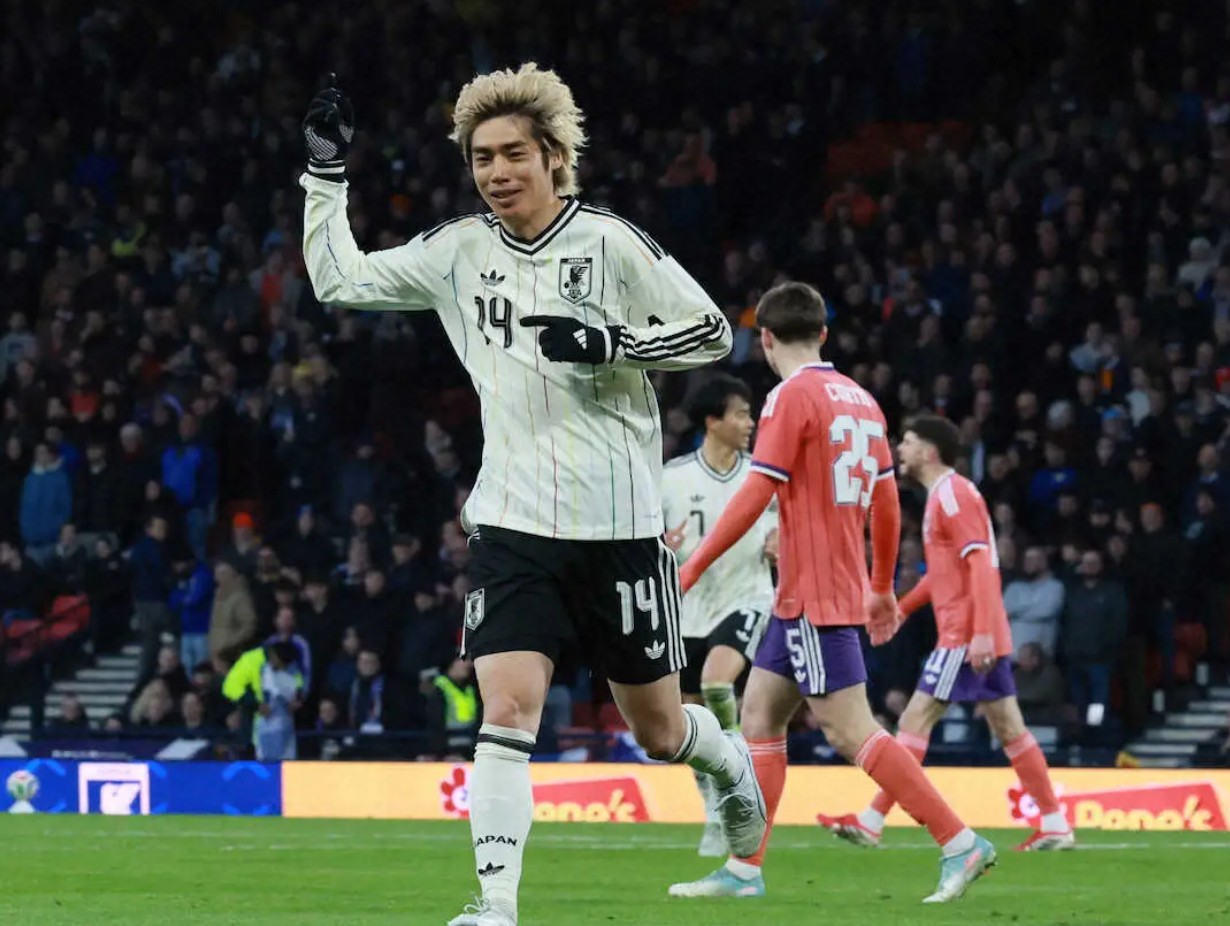 正在英國(guó)拉練的日本隊(duì)于當(dāng)?shù)貢r(shí)間3月28日進(jìn)行的一場(chǎng)國(guó)際友誼賽中,以1-0戰(zhàn)勝蘇格蘭隊(duì)。替補(bǔ)登場(chǎng)的33歲老將伊東純也(亨克)在下半場(chǎng)第39分鐘打入關(guān)鍵的制勝進(jìn)球。