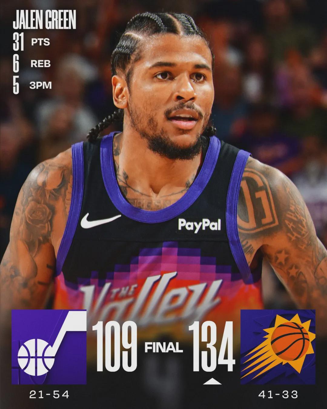 北京時間3月29日,NBA常規(guī)賽:太陽134-109大勝爵士。太陽球員杰倫-格林僅出戰(zhàn)22分鐘,22投13中,三分11中5,0罰球,拿到31分6籃板3助攻0失誤。格林上場22分鐘拿到30+,成為太陽隊史上出場時間最少的一場30+。