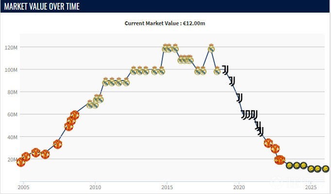 C羅的身價自2024年12月開始就是1200萬歐元,經(jīng)過兩年多之后,他的身價仍然沒有變化,此前,他的巔峰身價是2014年10月以及在2018年1月在皇馬時的1.2億歐元。