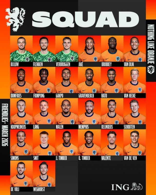 荷蘭名單:范戴克領(lǐng)銜,庫普梅納斯、廷伯入選