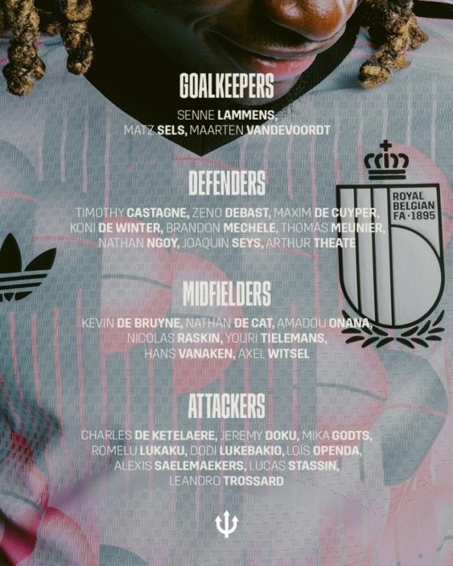 比利時隊名單:德布勞內(nèi)、盧卡庫、多庫、奧蓬達(dá)、特羅薩德在列