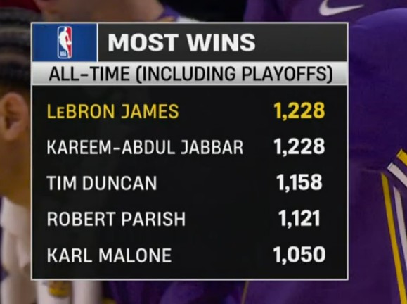 賽后根據(jù)統(tǒng)計,本場比賽勝利也是現(xiàn)年41歲的詹姆斯職業(yè)生涯至今在NBA拿到的第1228勝(包含季后賽),這也讓他追平了賈巴爾,并列成為NBA歷史取勝場次最多的球員。