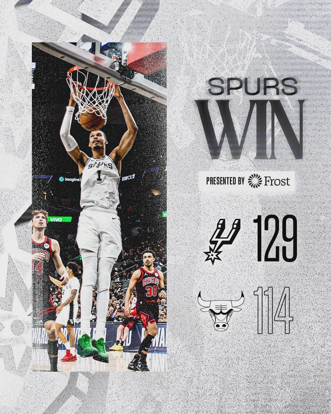 今天另外一場:馬刺129-114擊敗公牛豪取9連勝,馬刺57勝18負穩(wěn)居聯(lián)盟第二。文班僅用8分40秒拿到兩雙,NBA歷史最快紀錄。全場比賽,文班亞馬出戰(zhàn)30分29秒,投籃27中17,三分6中3,罰球4中4,狂砍41分16板4助3帽。