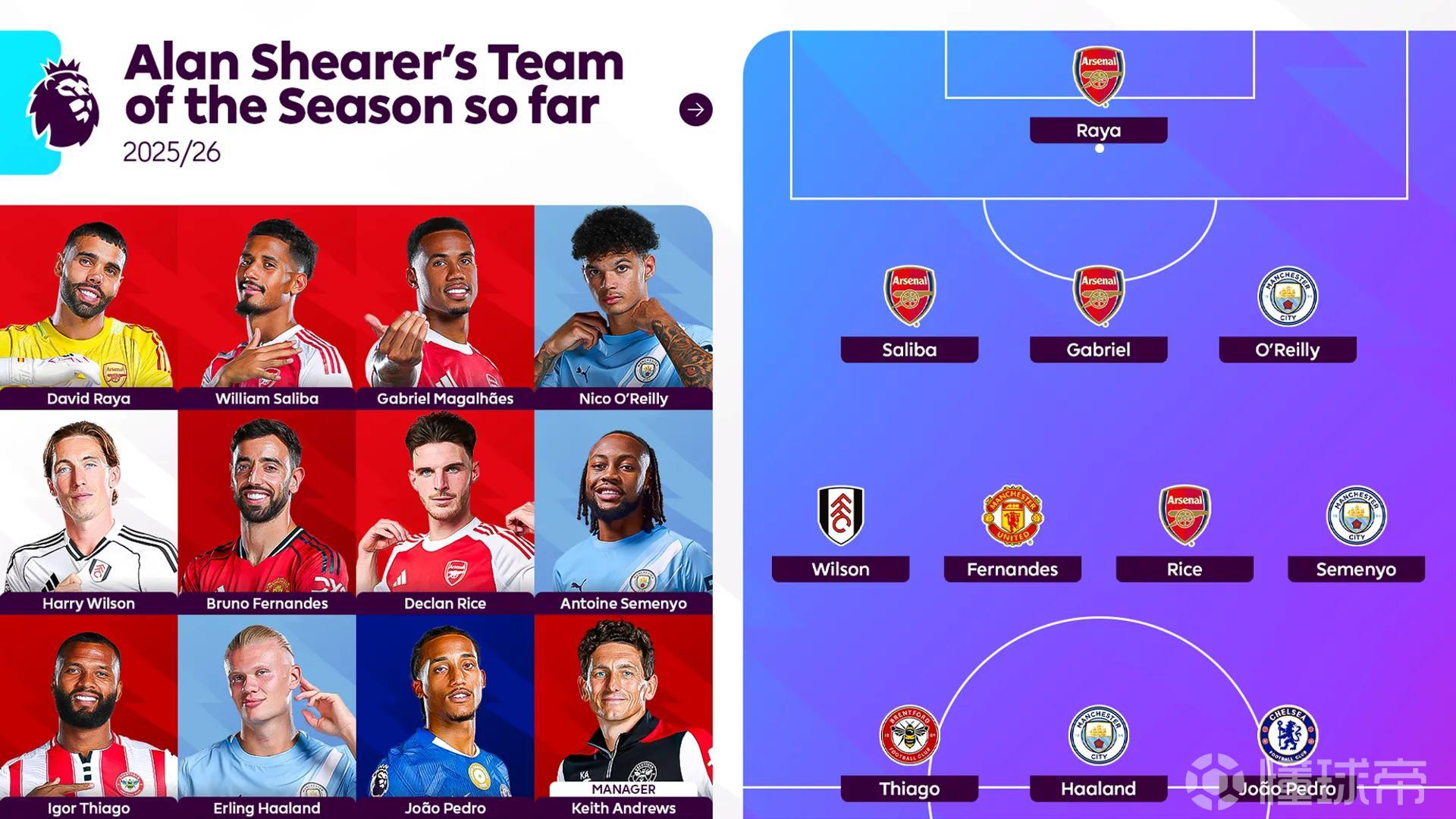 英超官方發(fā)布了阿蘭-希勒評選的本賽季至今最佳陣容,阿森納4人入選,曼城3人,布魯諾-費爾南德斯等人在列。