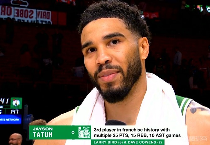 賽后根據(jù)統(tǒng)計,本場比賽25分18籃板11助攻的數(shù)據(jù)也讓塔圖姆成為了凱爾特人隊史繼拉里-伯德(8次)和戴夫-考恩斯(2次)之后,第三位單場交出至少25分15籃板10助攻數(shù)據(jù)的球員。