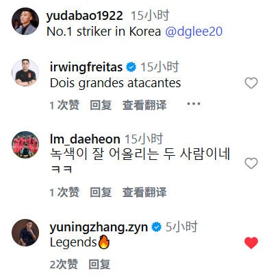 評論區(qū)中,現(xiàn)役國腳張玉寧以 “Legends” 配火焰表情留言,向兩位足壇名宿致敬。此外還有多國球迷評論,巴西球迷盛贊 “兩位偉大的前鋒”,而韓國球迷則是打趣“綠色衣服很適合他們”。