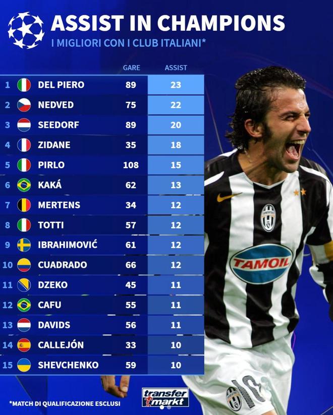 北京時(shí)間3月21日,德轉(zhuǎn)統(tǒng)計(jì)出瞭意甲球員歐冠歷史助攻榜,德?tīng)?皮耶羅以23次助攻位列第一,現(xiàn)役球員中誇德拉多排名最高,他以12次助攻位列第10位。