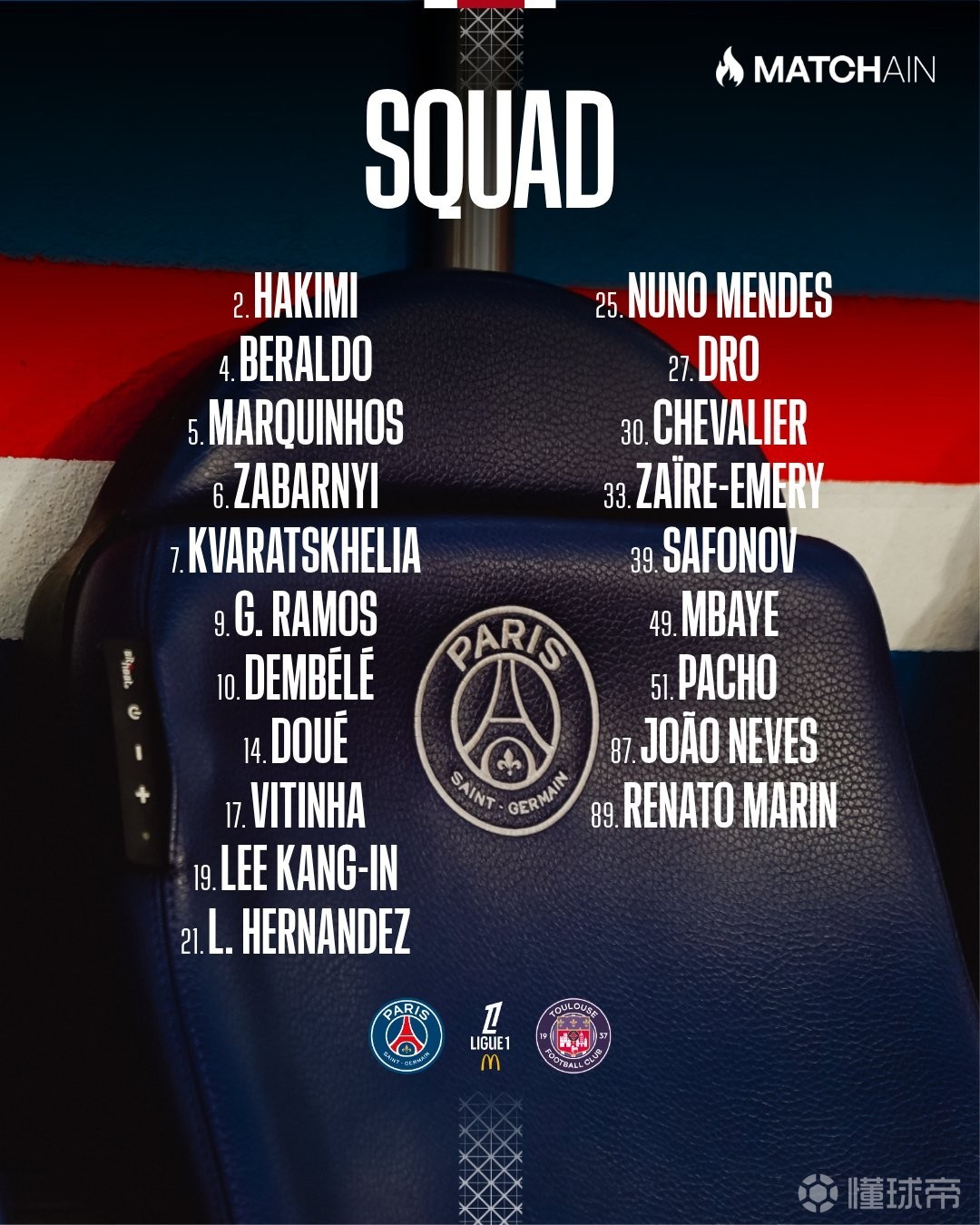 北京時(shí)間4月3日,巴黎官方公布聯(lián)賽第28輪主場對(duì)陣圖盧茲的大名單,登貝萊領(lǐng)銜,馬尤盧缺陣,阿什拉夫、內(nèi)維斯回歸。