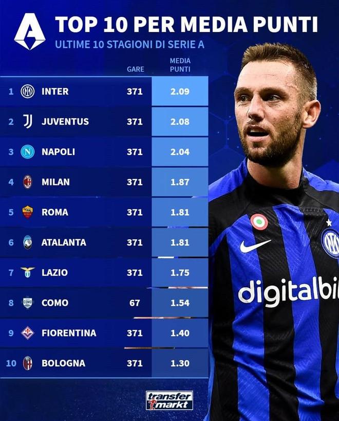 北京時間3月21日,德轉(zhuǎn)統(tǒng)計出瞭意甲近10年的場均積分排名,國際米蘭以2.09分位列第一,尤文圖斯2.08分第二,那不勒斯2.04分第三,AC米蘭1.87分第四。
