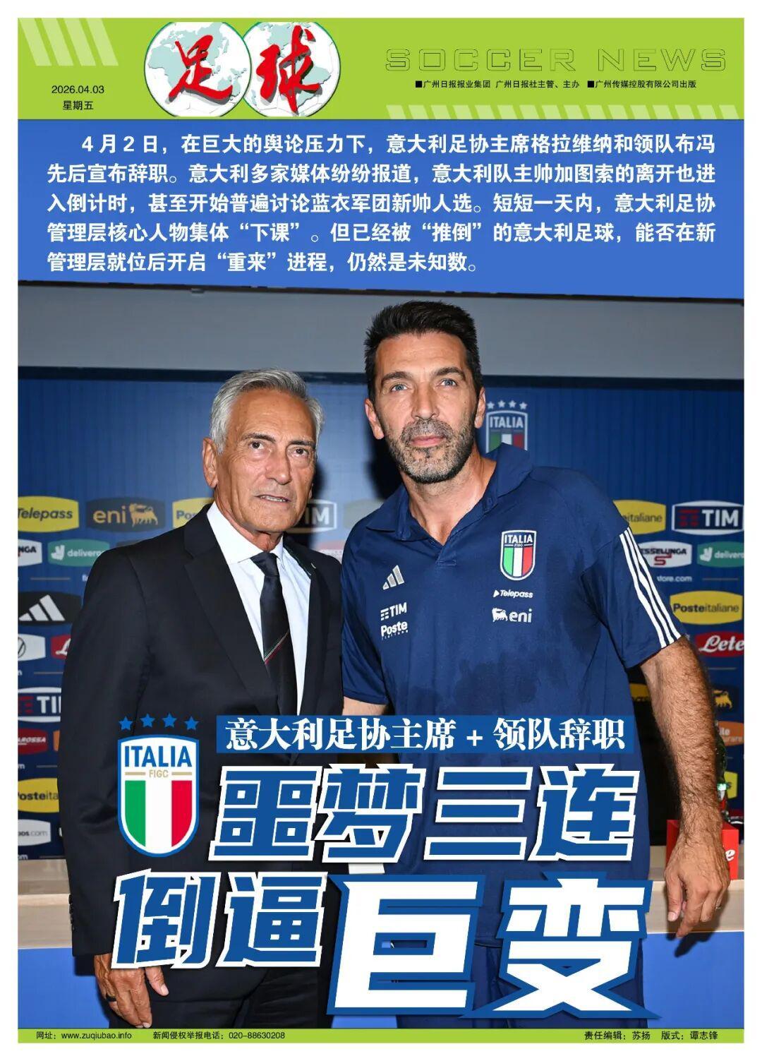 撰稿/寒冰連續(xù)3次無(wú)緣世界杯,終于迫使意大利足壇發(fā)生最激烈的巨變。4月2日,在巨大的輿論壓力下,意大利足協(xié)主席格拉維納和領(lǐng)隊(duì)布馮先后宣布辭職。意大利多家媒體紛紛報(bào)道,意大利隊(duì)主帥加圖索的離開也進(jìn)入倒計(jì)時(shí),甚至開始普遍討論藍(lán)衣軍團(tuán)新帥人選。短短一天內(nèi),意大利足協(xié)管理層核心人物集體“下課”。但已經(jīng)被“推倒”的意大利足球,能否在新管理層就位后開啟“重來”進(jìn)程,仍然是未知數(shù)。