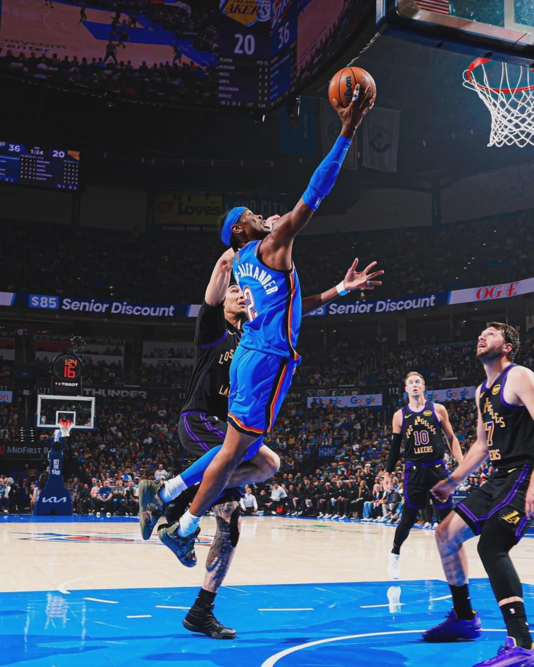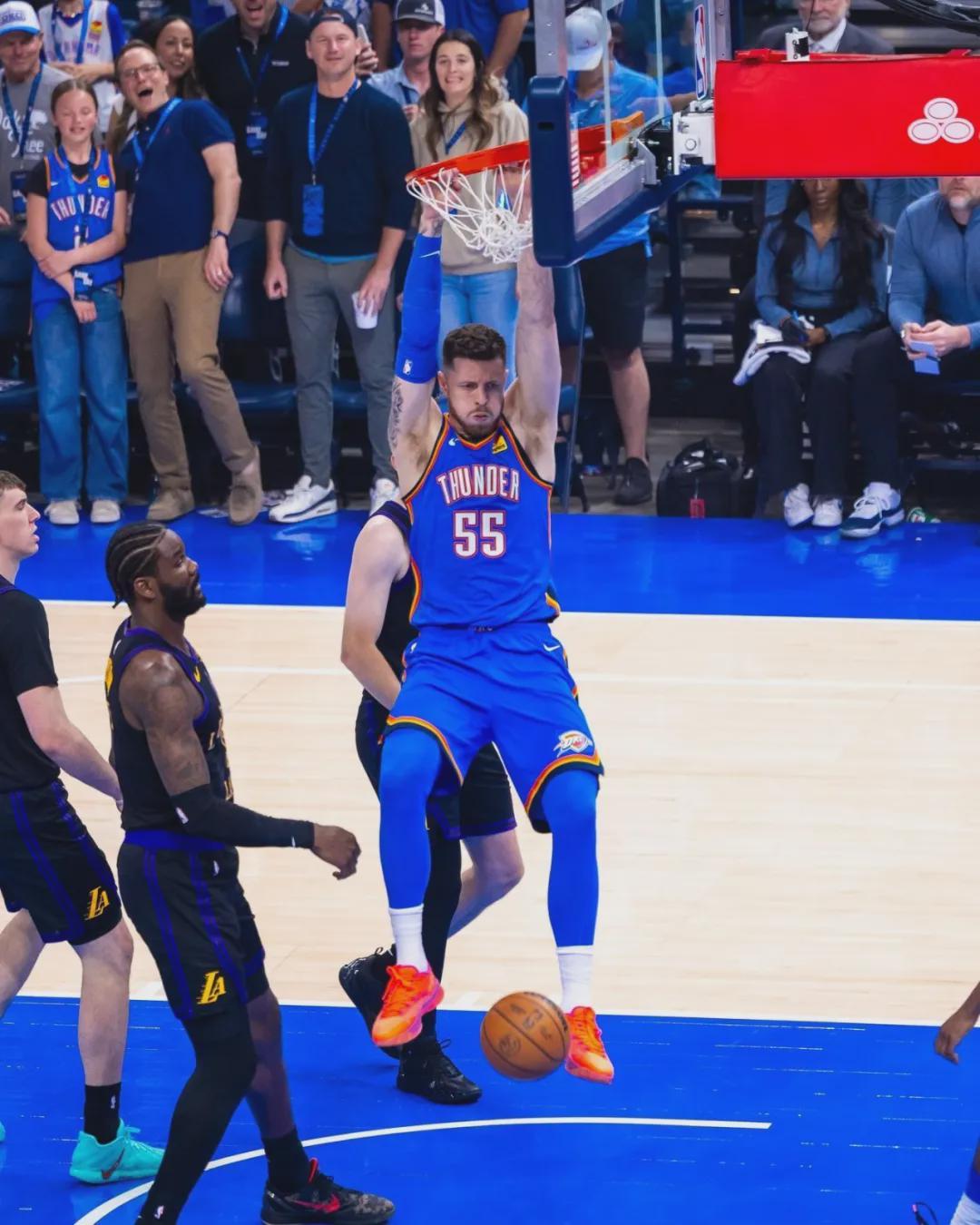 兩隊的防守差距,很難想象這是西部第一和第三的較量。首節(jié)戰(zhàn)罷,雷霆44-21領(lǐng)先湖人23分。多爾特彈無虛發(fā),5中5獨得14分2搶斷,而且把東契奇限制到單節(jié)6中1!湖人這21分當(dāng)中,有8分來自罰球(10中8),雷霆罰球3中3。