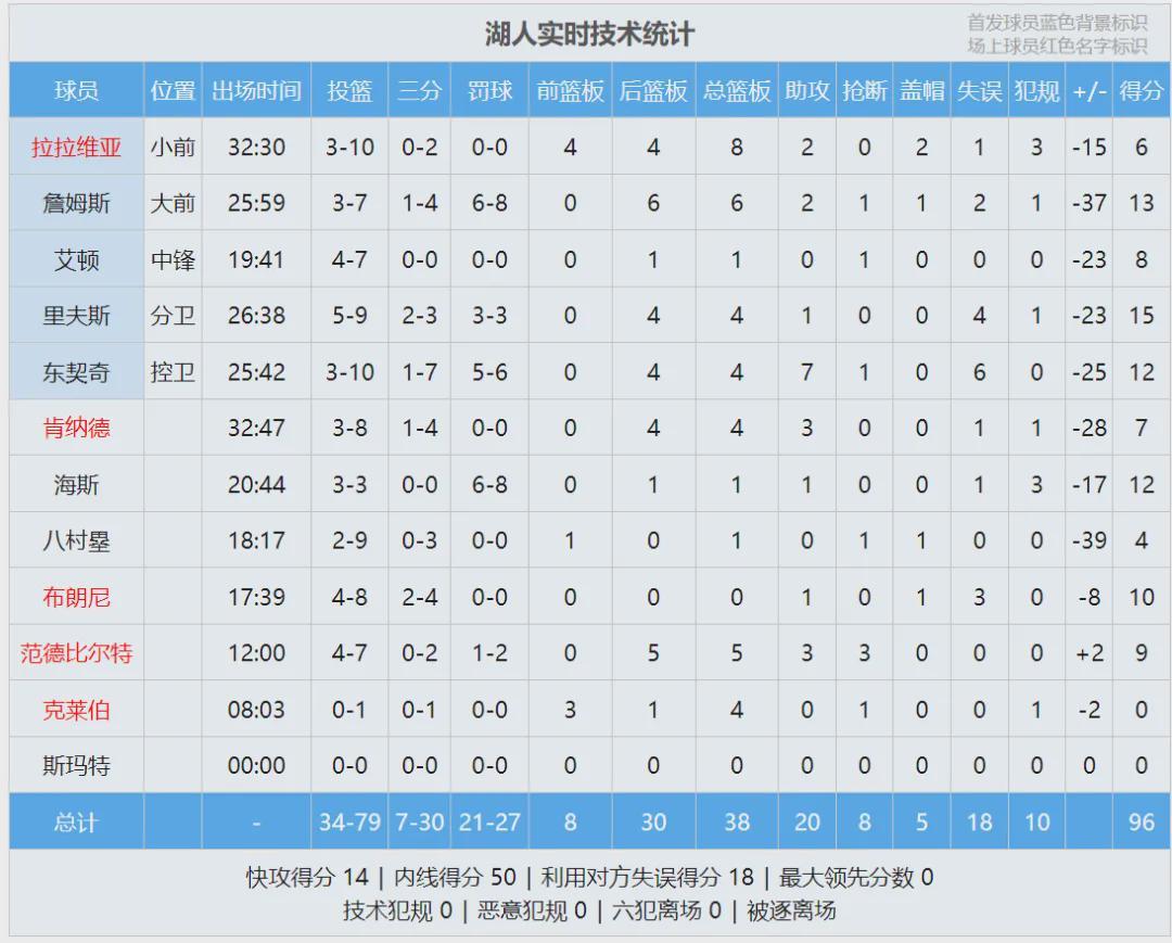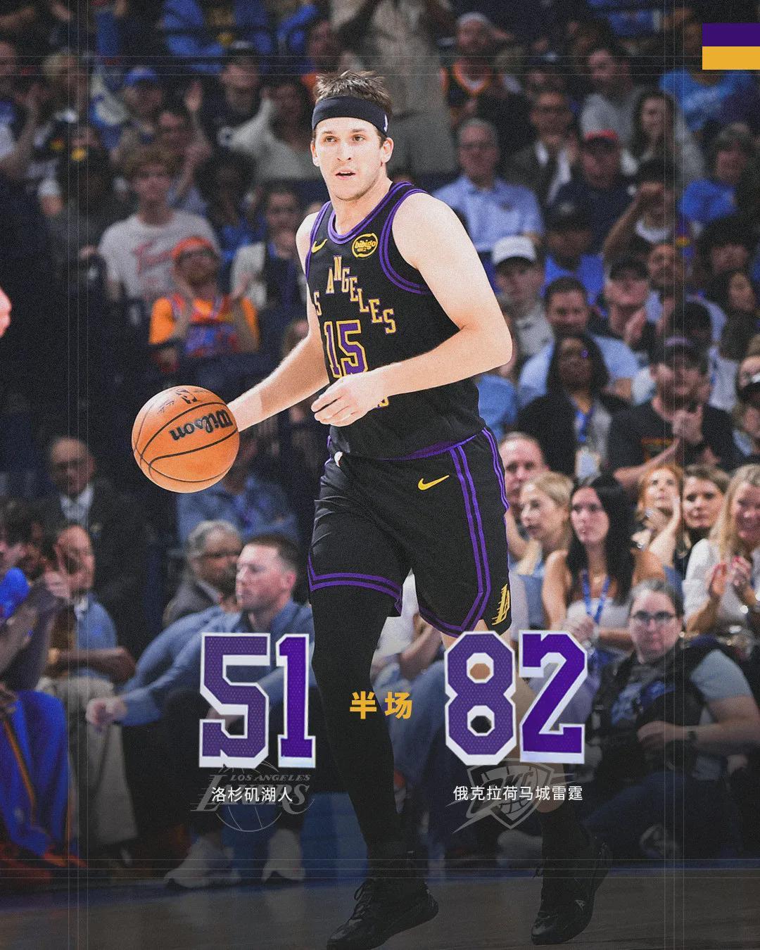 第二節(jié)雷霆再轟38分,半場打完,雷霆82-51領(lǐng)先湖人31分。里夫斯7中5拿到14分4失誤,東契奇9中2得到10分4板5助4失誤,詹姆斯3中1拿到8分3板2助2失誤。湖人上半場罰球18中15,三分16中4;雷霆罰球10中9,三分19中9。