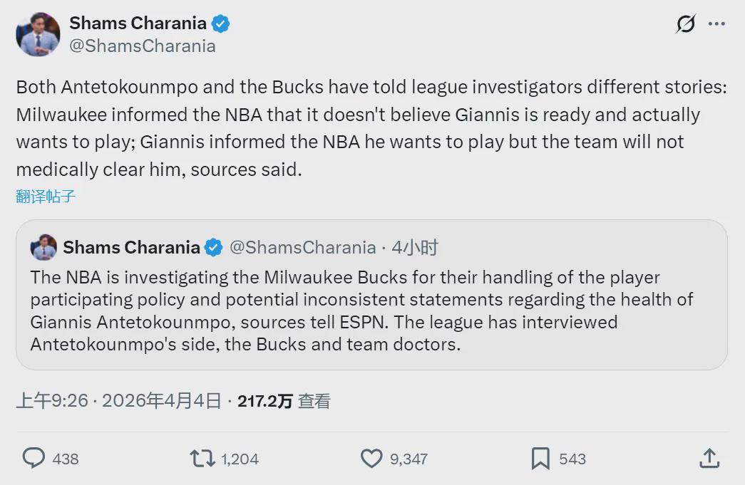 今天咱們要寫的并不是凱爾特人雙探花,而是雄鹿和字母哥。雄鹿和凱爾特人的比賽還沒結(jié)束時(shí),ESPN名記Shams爆料,NBA官方正在調(diào)查雄鹿是否存在禁止球員參賽以及故意擺爛的行為,聯(lián)盟調(diào)查對(duì)象包括字母哥團(tuán)隊(duì),雄鹿管理層以及隊(duì)醫(yī)。