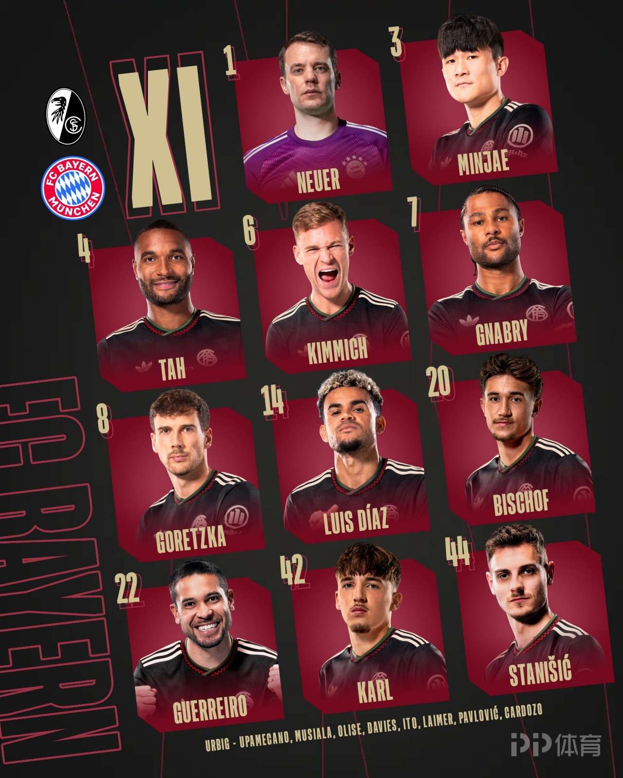 拜仁首發(fā):1-諾伊爾、3-金玟哉、4-塔、22-格雷羅、44-斯坦尼西奇、6-基米希、8-格雷茨卡、20-比朔夫、14-路易斯·迪亞斯、42-卡爾、7-格納布里