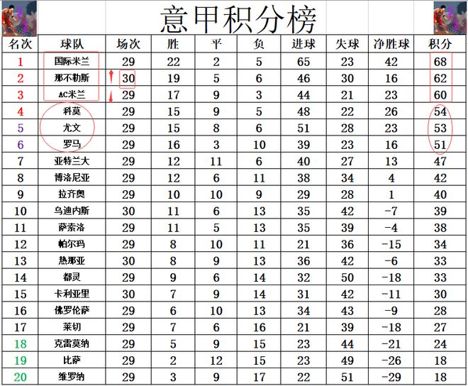 積分榜方面,國米繼續(xù)穩(wěn)穩(wěn)領(lǐng)跑,那不勒斯連續(xù)4輪一球小勝奪4連勝,先賽的他們暫時超過AC米蘭2分升至第2。爭四很激烈,黑馬科莫1分優(yōu)勢力壓尤文守住第4,羅馬3分之差排在第6。