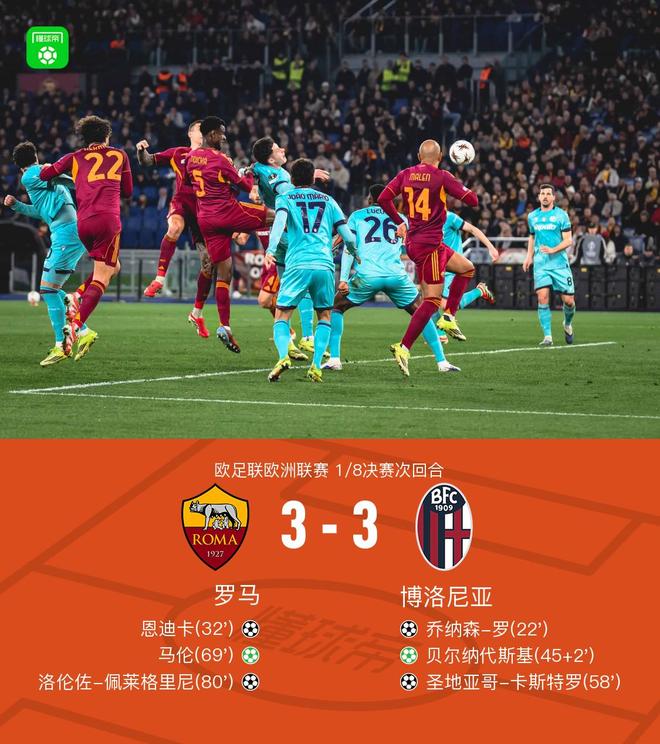 北京時間3月20日歐足聯(lián)歐洲聯(lián)賽 1/8決賽次回合,羅馬對陣博洛尼亞。羅馬恩迪卡破門,洛倫佐-佩萊格裡尼破門,馬倫破門。博洛尼亞喬納森-羅破門,聖地亞哥-卡斯特羅破門,貝爾納代斯基破門。最終比分羅馬 3-3 博洛尼亞。兩回合總比分羅馬4-4博洛尼亞。