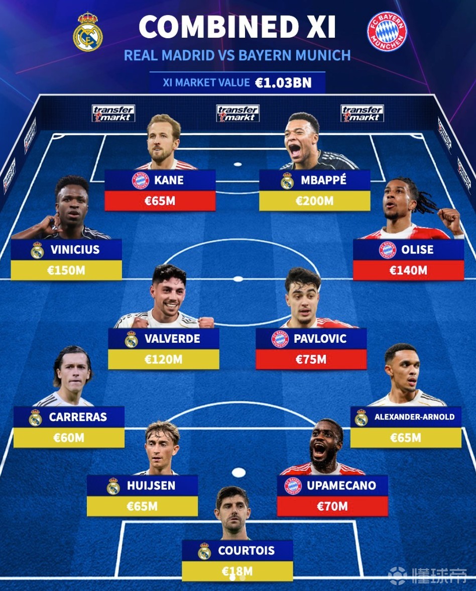 北京時(shí)間4月7日,在歐冠1/4決賽首回合皇家馬德里主場(chǎng)與拜仁慕尼黑的焦點(diǎn)戰(zhàn)即將打響的情況下,德轉(zhuǎn)列出了兩支球隊(duì)目前身價(jià)最高的11人陣容,皇馬7人入選,姆巴佩2億歐元領(lǐng)銜,拜仁占據(jù)4席。