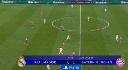 第41分鐘,格納布里直塞,迪亞斯前插推射破門,拜仁1-0皇馬