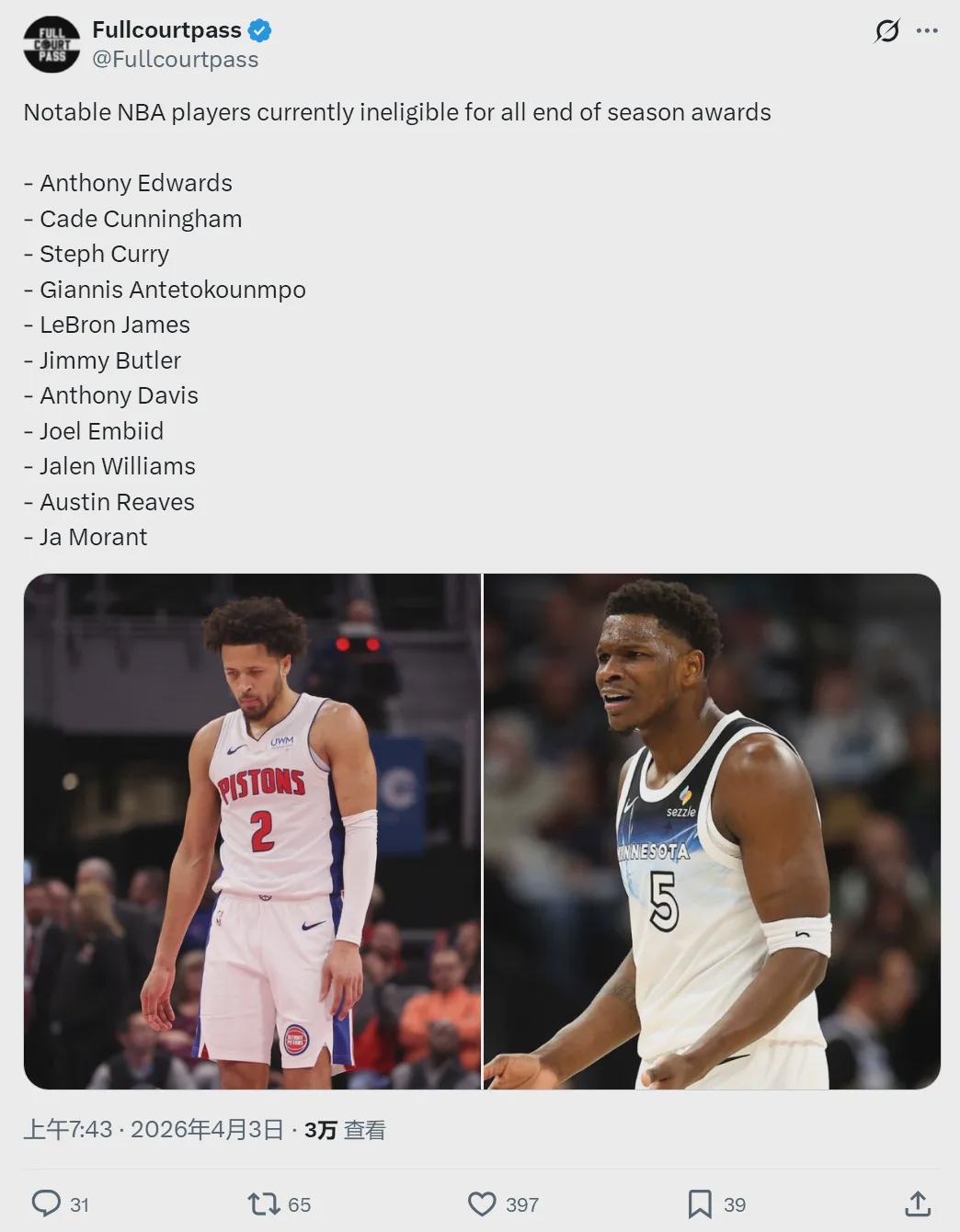 截至目前,愛(ài)德華茲打了59場(chǎng)常規(guī)賽。不算今天這場(chǎng)比賽,森林狼還有6場(chǎng)比賽要打。如果華子剩余6場(chǎng)保持全勤,不是剛好65場(chǎng)嗎?本賽季第三場(chǎng)比賽(10月27日),愛(ài)德華茲只打了3分鐘傷退,出戰(zhàn)不足15分鐘,因此并不算數(shù)。