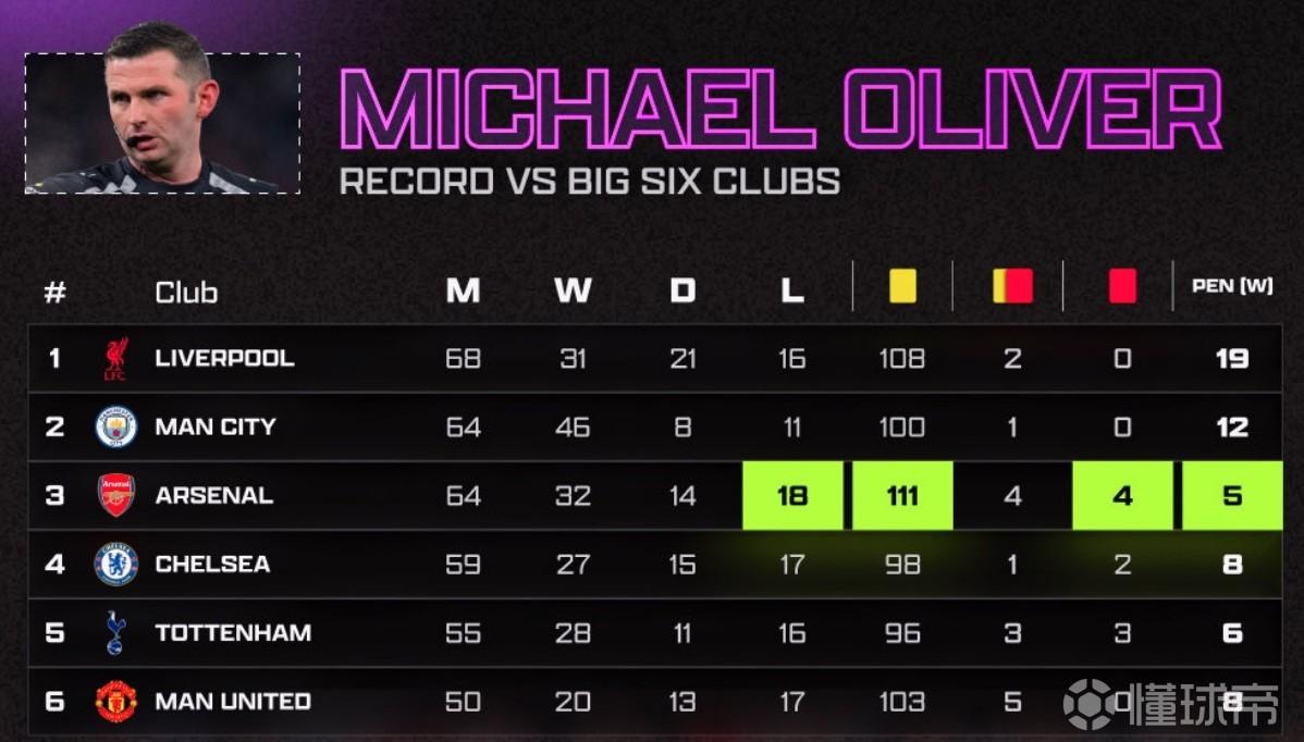 數(shù)據(jù)顯示,奧利弗執(zhí)法過阿森納64場比賽,總共向阿森納出示過111張黃牌和4張紅牌,這兩項數(shù)據(jù)均為其執(zhí)法所有球隊之最,顯示出槍手在其判罰尺度下受到的紀律處罰尤為突出。