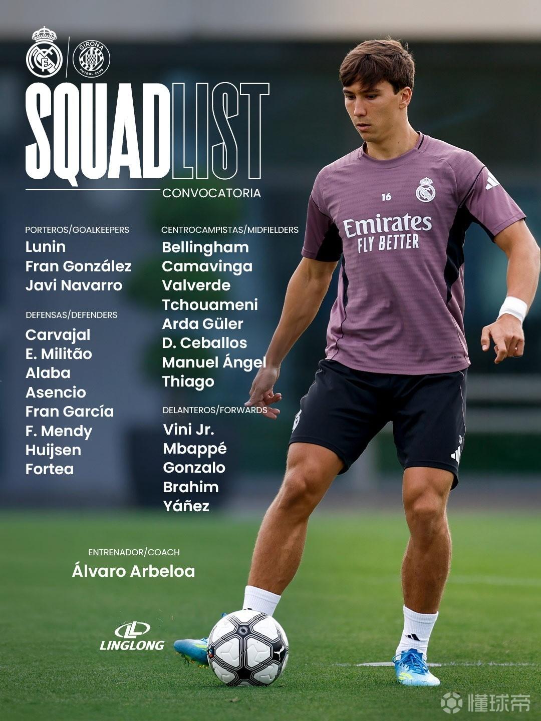 后衛(wèi):卡瓦哈爾、米利唐、阿拉巴、勞爾-阿森西奧、弗蘭-加西亞、費(fèi)蘭-門迪、赫伊森、福特亞