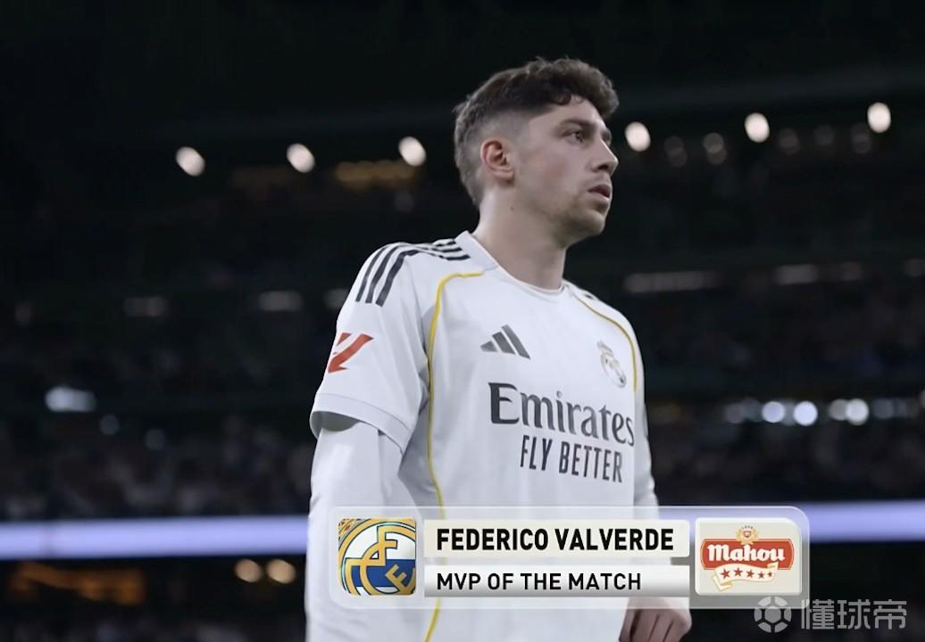 西甲第31輪,皇家馬德里主場1-1戰(zhàn)平赫羅納,此役打入一球的皇馬中場巴爾韋德當選西甲官方全場最佳球員。