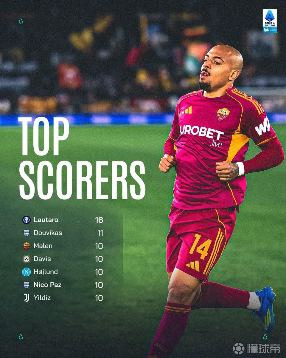 此役主場(chǎng)對(duì)陣比薩,馬倫完成意甲生涯首次帽子戲法。至此,這位荷蘭前鋒自冬窗加盟以來(lái)在意甲出場(chǎng)12次已打入10球,這使得他在意甲射手榜上與霍伊倫、尼科-帕斯、伊爾迪茲、凱南-戴維斯等人并列第三,僅次于打入16球的勞塔羅和打入11球的杜維卡斯。