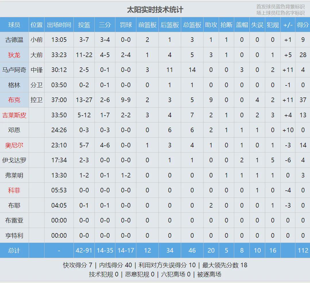 太陽雖然鎖定西部第7,但球隊仍有傷病隱患:杰倫-格林開場不到4分鐘就因右膝傷勢退賽,此役他2投0中拿到0分1板0助,正負值-1。中場休息時,杰倫-格林出來熱身,可惜無法重新登場。此外,喬丹-古德溫也因腳踝傷勢退出比賽。