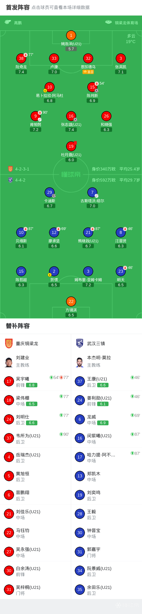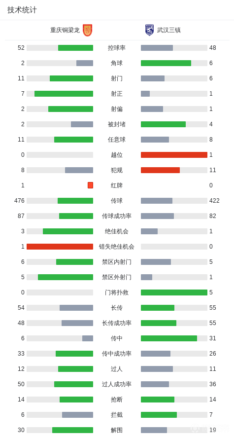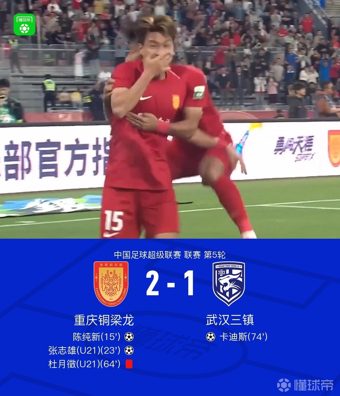 北京時(shí)間4月11日中國(guó)足球超級(jí)聯(lián)賽第5輪,重慶銅梁龍主場(chǎng)對(duì)陣武漢三鎮(zhèn)。重慶銅梁龍陳純新、張志雄分別破門,杜月徵染紅??ǖ纤拱饣匾怀?。最終比分重慶銅梁龍2-1武漢三鎮(zhèn)。