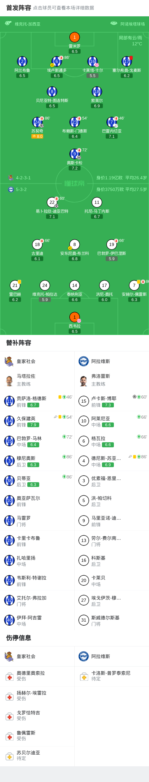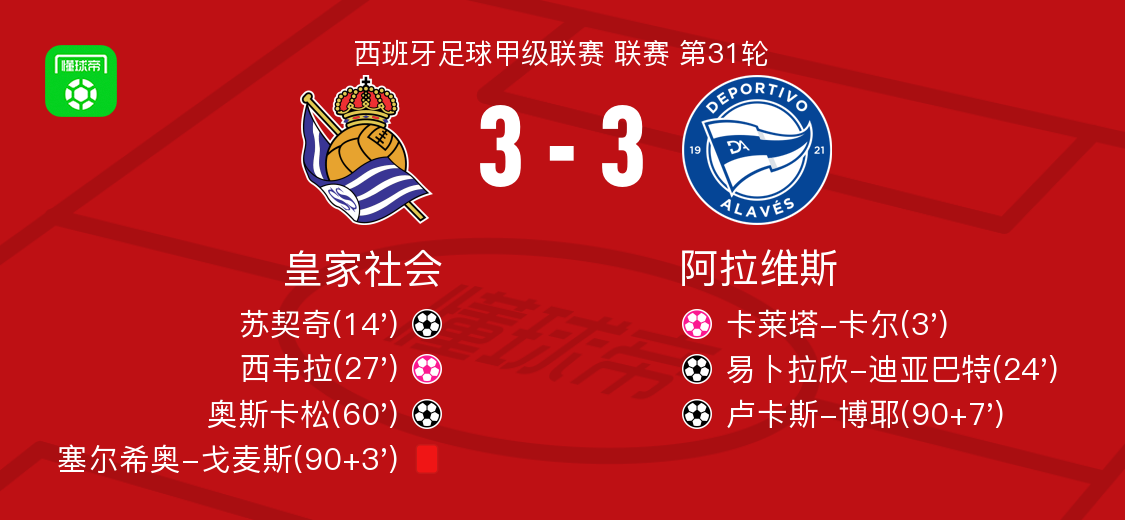 北京時間4月11日西班牙足球甲級聯(lián)賽 聯(lián)賽 第31輪,皇家社會主場對陣阿拉維斯?;始疑鐣K契奇破門,奧斯卡松破門,卡萊塔-卡爾自擺烏龍。阿拉維斯易卜拉欣-迪亞巴特破門,盧卡斯-博耶破門,西韋拉自擺烏龍。最終比分皇家社會 3-3 阿拉維斯。