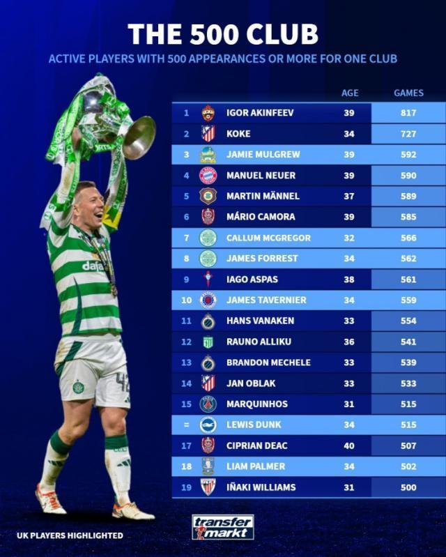 畢爾巴鄂前鋒伊納基·威廉姆斯如今已為球隊(duì)出戰(zhàn)500場比賽,在現(xiàn)役球員中排名第19位。在現(xiàn)役球員中,為單一俱樂部至少出戰(zhàn)500場比賽的球員中,阿金費(fèi)耶夫以817場居首,科克以727場位居次席,諾伊爾則以590次位居第4位。