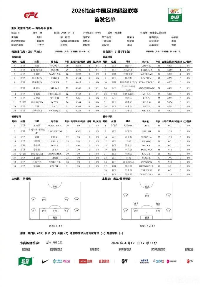 北京時(shí)間4月12日19:00,中超第5輪,天津津門虎主場(chǎng)迎戰(zhàn)青島海牛,本場(chǎng)主裁是劉釗,VAR是甘樹(shù)然。津門虎替補(bǔ)名單僅10人,孫銘謙、郭皓未進(jìn)入大名單。雙方名單詳情如下: