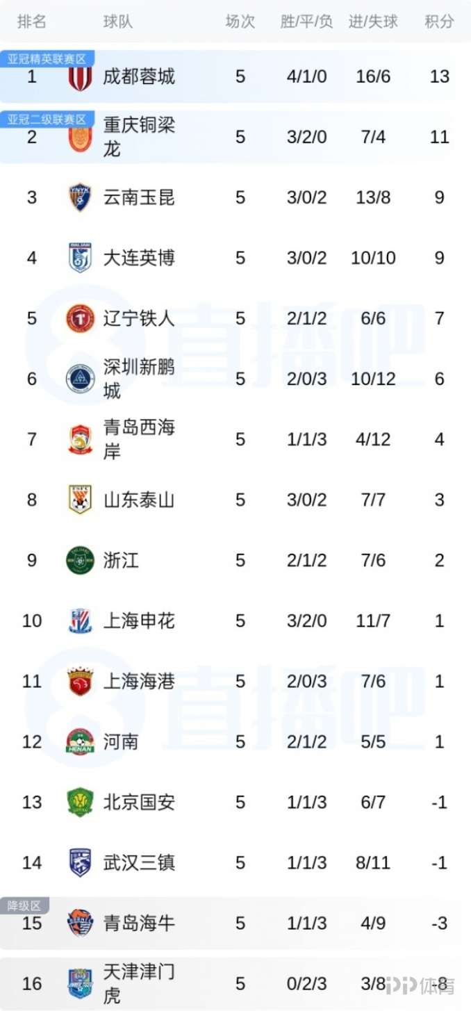 中超第5輪結(jié)束,目前西南三支球隊成都蓉城、重慶銅梁龍、云南玉昆前三,兩支東北地區(qū)球隊大連英博和遼寧鐵人緊隨其后。