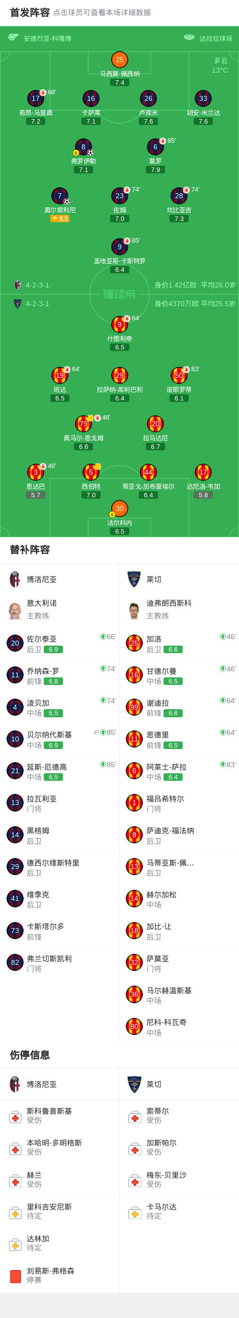 第26分鐘,博洛尼亞球員弗羅伊勒打入一球。