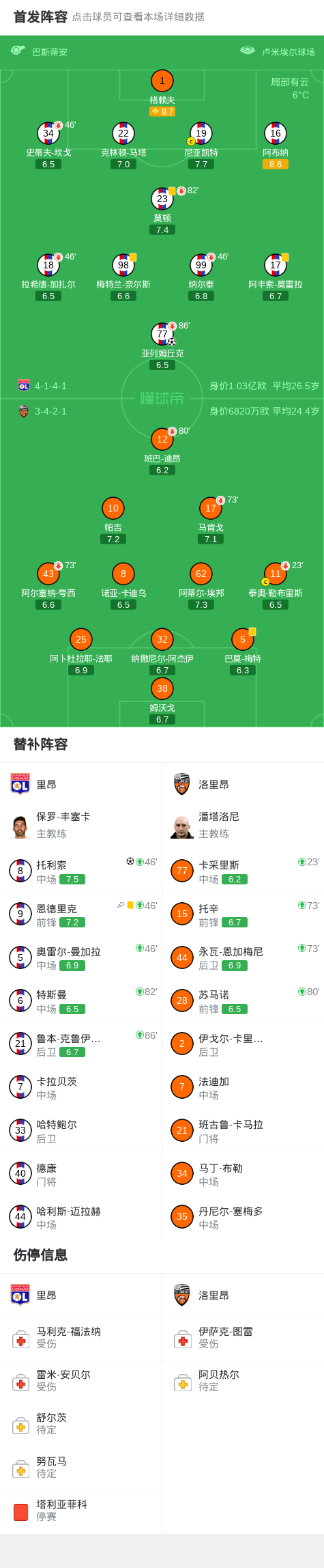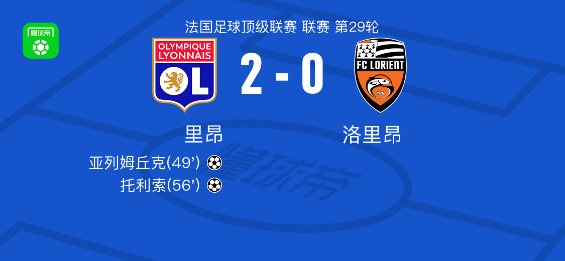 北京時(shí)間4月13日法國足球頂級(jí)聯(lián)賽 聯(lián)賽 第29輪,里昂主場對(duì)陣洛里昂。里昂亞列姆丘克破門,托利索破門。最終比分里昂 2-0 洛里昂。
