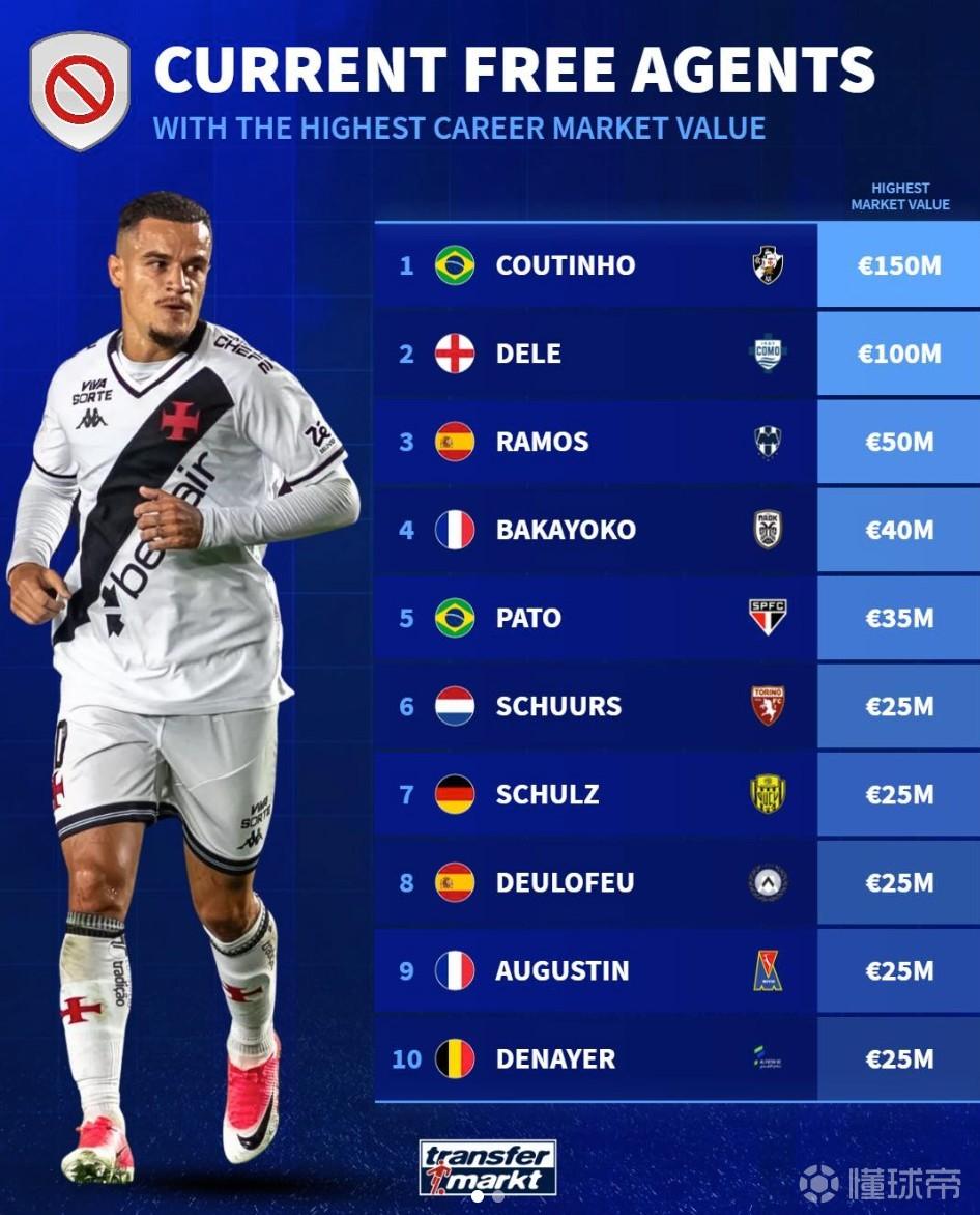 北京時(shí)間4月13日,德轉(zhuǎn)列出了目前自由身球員生涯最高身價(jià)榜,庫蒂尼奧1.5億歐元高居第一,阿里1億歐元第二,拉莫斯5000萬歐元第三。
