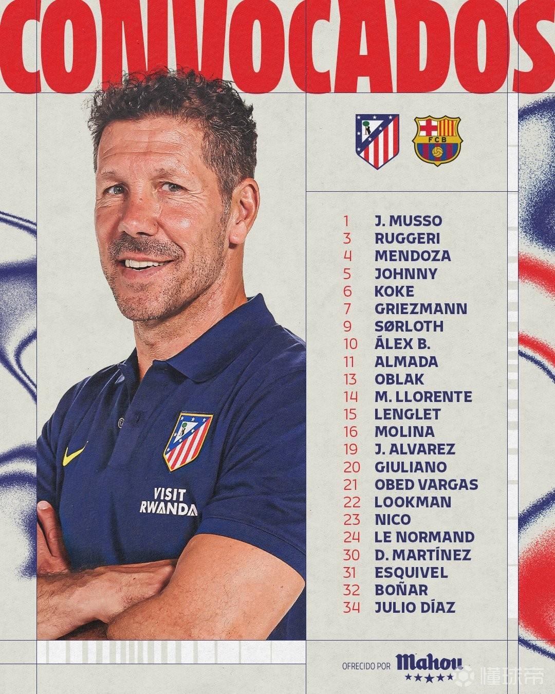前鋒:7-格列茲曼、9-瑟洛特、10-巴埃納、11-阿爾馬達(dá)、19-阿爾瓦雷斯、20-朱利亞諾-西蒙尼、22-盧克曼、23-尼古拉斯-岡薩雷斯