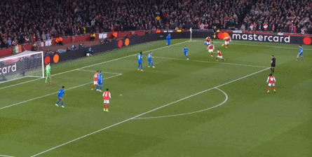 但是,隨著隊形的向前,三線的距離就會變得難以保持,這是面對比分落后的球隊最難以處理的問題,也是比分領(lǐng)先的球隊需要把握的機會,所以到了下半場,阿森納依然可以通過長傳球打進兩線之間,從而銜接射門: