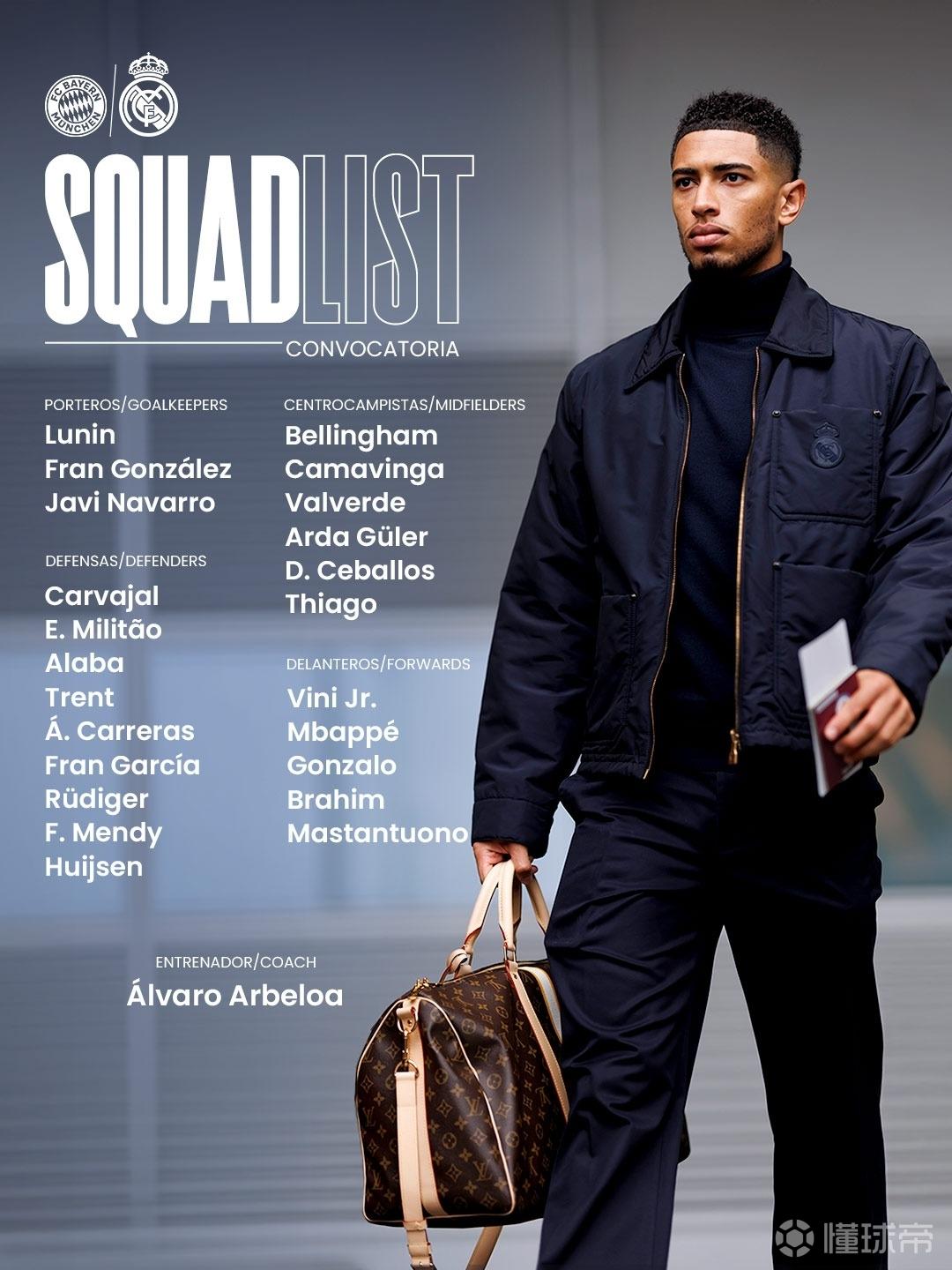 后衛(wèi):卡瓦哈爾、米利唐、阿拉巴、阿諾德、阿爾瓦羅-卡雷拉斯、弗蘭-加西亞、呂迪格、門迪、赫伊森