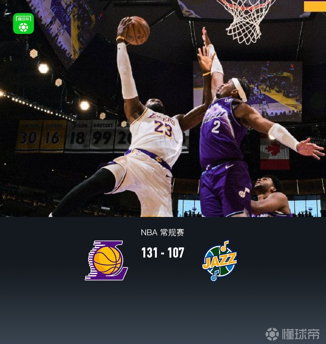 北京時(shí)間4月13日NBA 常規(guī)賽,洛杉磯湖人對(duì)陣猶他爵士。上半場(chǎng)湖人詹姆斯拿下18分幫助球隊(duì)建立17分領(lǐng)先,半場(chǎng)湖人62-45爵士,下半場(chǎng)詹姆斯提前打卡休息,第三節(jié)湖人依靠艾頓、布朗尼發(fā)揮取得20分以上領(lǐng)先,最終湖人131-107爵士,最終湖人排名西部第四。