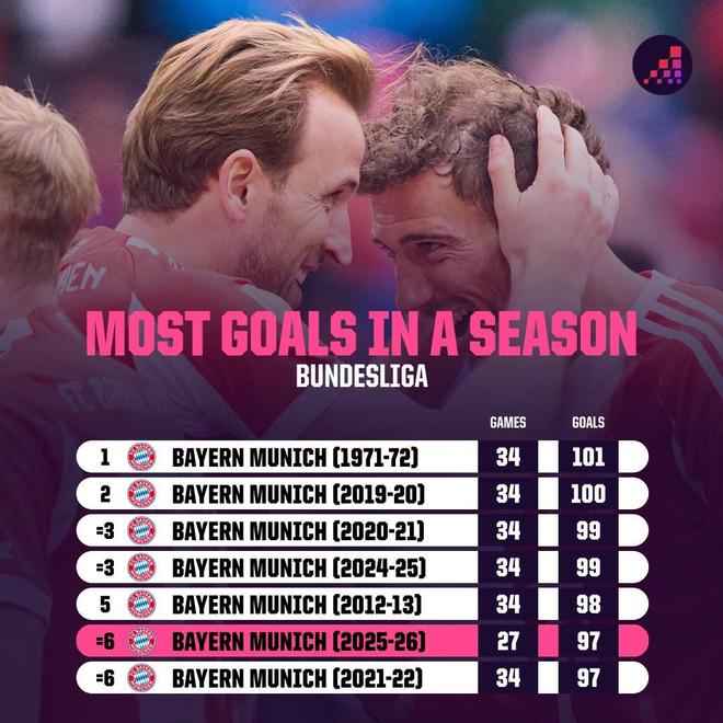 拜仁在今天戰(zhàn)勝柏林聯(lián)合的比賽中又打進(jìn)4球,這意味著他們本賽季在德甲已經(jīng)打進(jìn)97球。在最后7場比賽中,他們只需要再打進(jìn)5球,就可以打破自己在1971-72賽季創(chuàng)造的德甲紀(jì)錄(101球)。