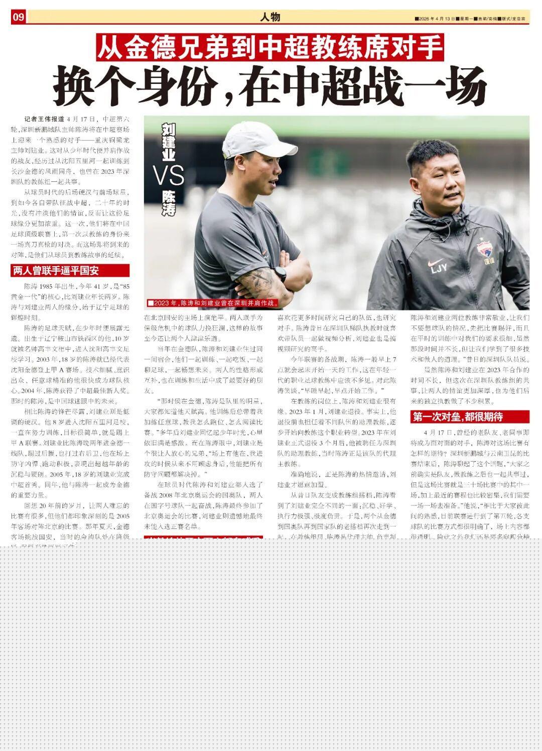 2026年,陳濤執(zhí)掌深圳新鵬城,劉建業(yè)帶領(lǐng)重慶銅梁龍,兩人在中超賽場首次正面交鋒。身份變了,但陳濤與劉建業(yè)始終欣賞與敬重對方。